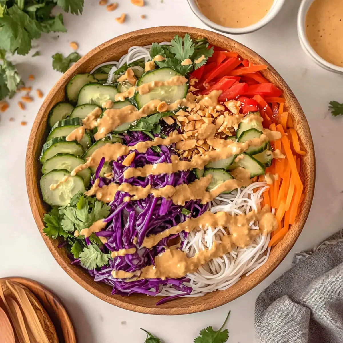 Prep Ahead: For convenience, you can prepare all the ingredients and store them separately, dressing right before serving to ensure a crisp and vibrant Spring Roll Salad with Peanut Sauce.