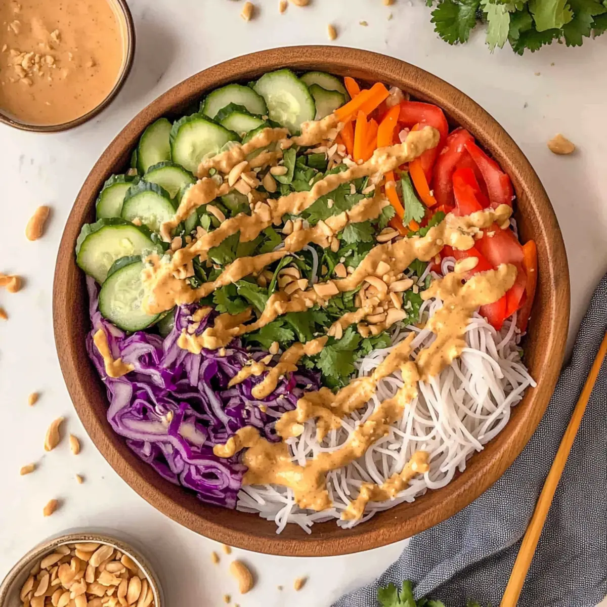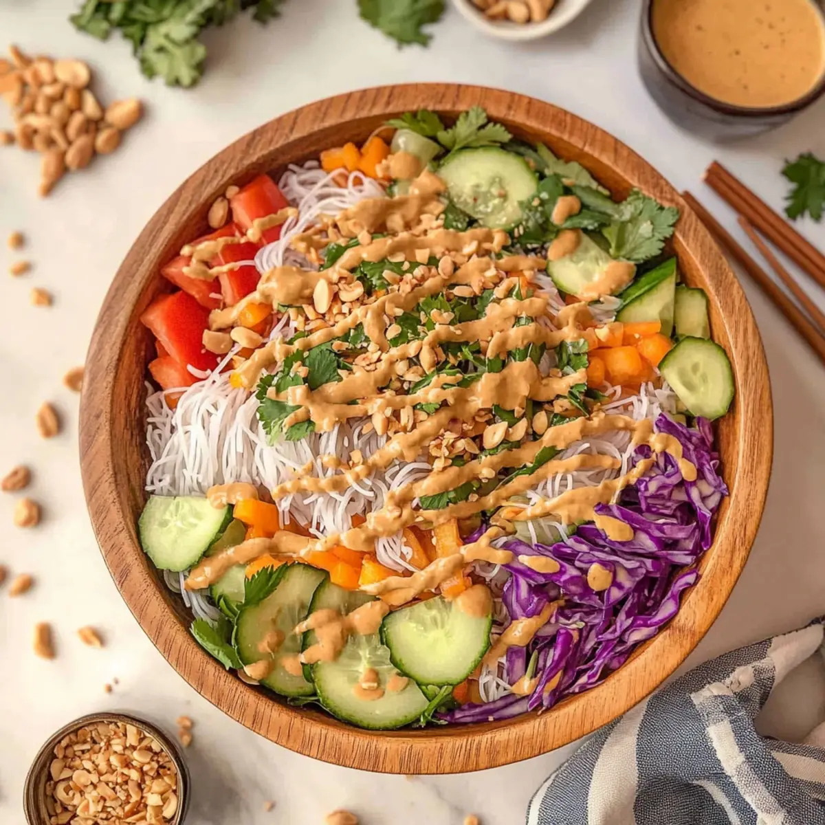 These Spring Roll Salad with Peanut Sauce components are perfect for meal prep enthusiasts! You can prepare the peanut dressing up to 3 days in advance, storing it in an airtight container in the refrigerator to maintain its creamy texture. Additionally, the cooked noodles can be prepped ahead the night before; just rinse them with cool water to stop the cooking process and refrigerate. For the fresh veggies, wash and chop them up to 24 hours ahead, but keep the cucumber and herbs separate until serving to prevent sogginess. When you’re ready to enjoy your salad, simply toss the noodles and veggies with the dressing, garnish with peanuts, and you’ll have a delicious, fresh meal ready in no time!