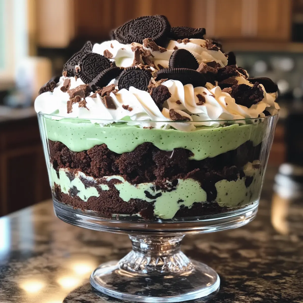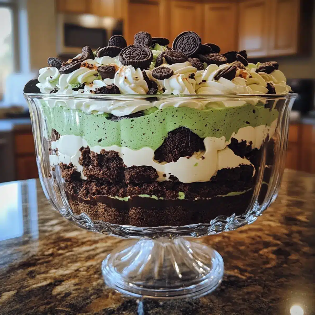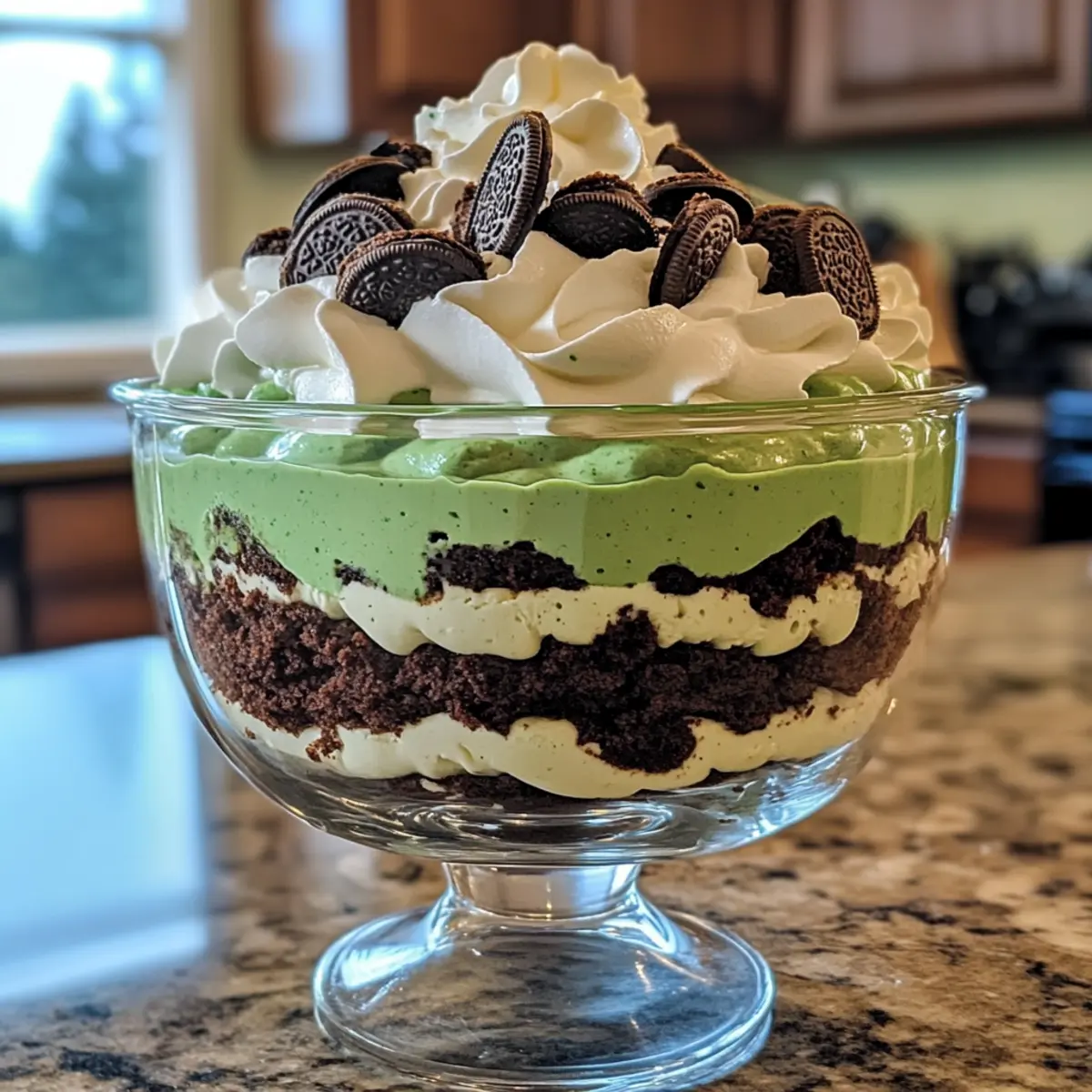 In a clear trifle bowl, start assembling your trifle by adding half of the brownie cubes in an even layer at the bottom. Make sure they’re nicely distributed. Next, spoon half of the creamy mint pudding over the brownie layer, followed by half of the thawed whipped topping. Sprinkle a handful of the crushed Oreos on top for added texture and flavor.
