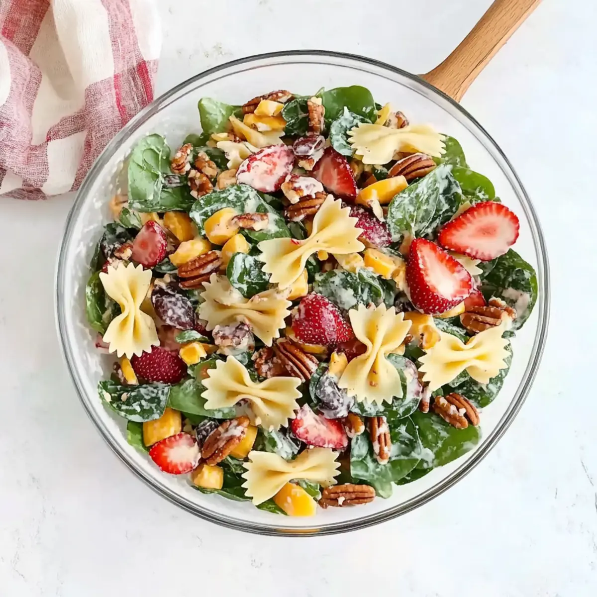 In a large mixing bowl, combine the cooled pasta, hulled and sliced strawberries, halved red grapes, finely chopped red onion, and fresh baby spinach. Next, add the drained mandarin oranges and pecans. Gently toss the ingredients together, ensuring that the vibrant colors and textures are evenly distributed throughout this Strawberry Fields Pasta Salad.