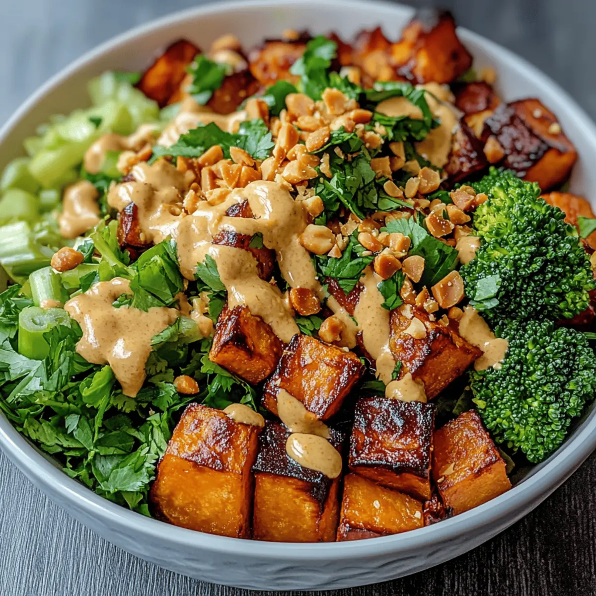 Once the sweet potatoes have finished roasting and are beautifully golden, it’s time to assemble your Thai Peanut Sweet Potato Buddha Bowl. Start by layering the mixed vegetables at the base of your serving bowls. Next, add a generous scoop of the crispy roasted sweet potatoes on top, and then drizzle a liberal amount of the homemade peanut sauce over everything.
