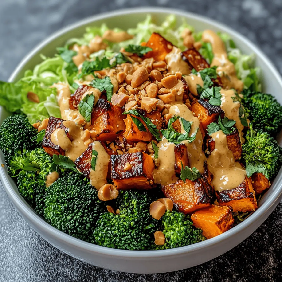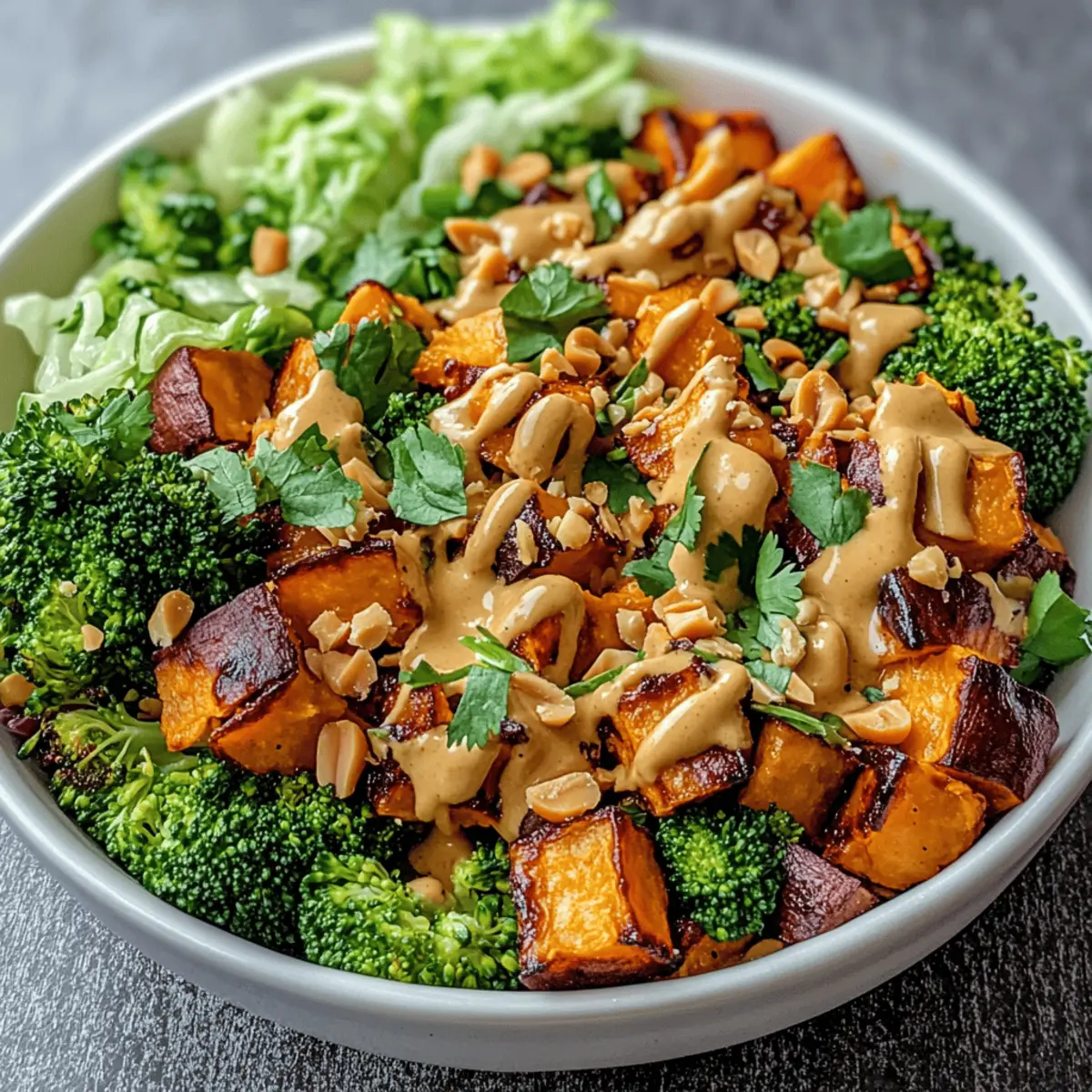 While the sweet potatoes are roasting, grab a large mixing bowl and combine the chopped broccoli florets, shredded cabbage, grated carrots, and sliced avocado. Gently toss these fresh ingredients together, allowing the vibrant colors to blend beautifully. This mixture will form the nutritious base of your Thai Peanut Sweet Potato Buddha Bowl, providing a variety of textures and flavors that complement the roasted sweetness.