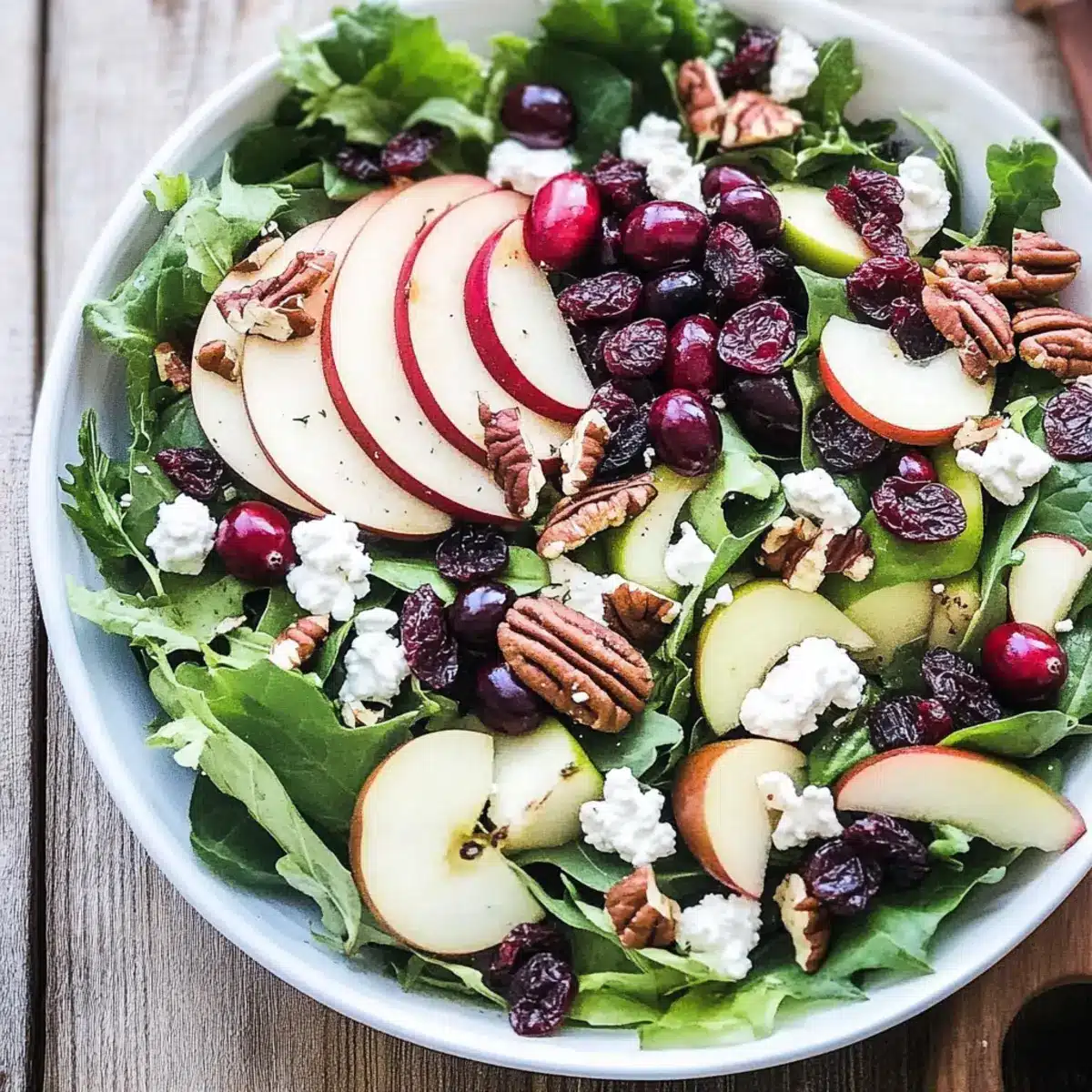 - In a large mixing bowl, combine fresh mixed greens, vibrant cranberries, crunchy pecans, and thinly sliced apples. Gently toss to ensure an even distribution of colors and textures.