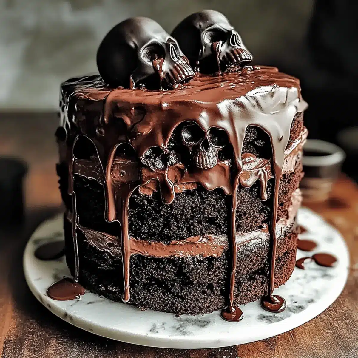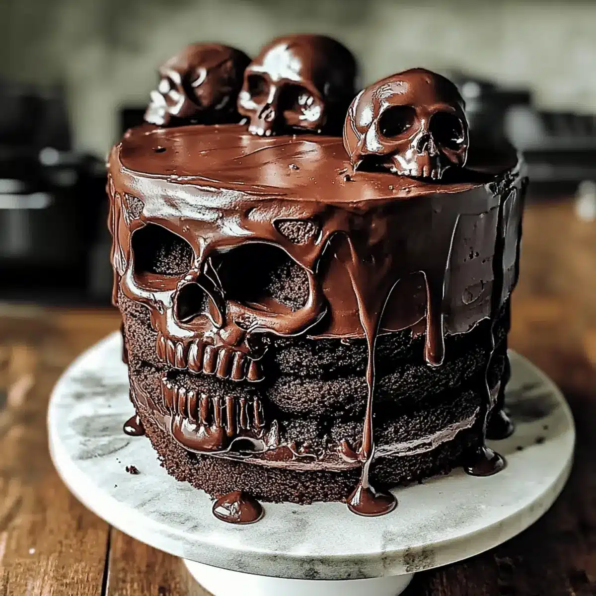 Pour the warm ganache over the frosted cake, using a spatula to help it drip down the sides for that beautifully decadent look. Work quickly for an even drip effect, ensuring your Vegan Chocolate Layer Skull Cake is visually stunning and ready for decoration.